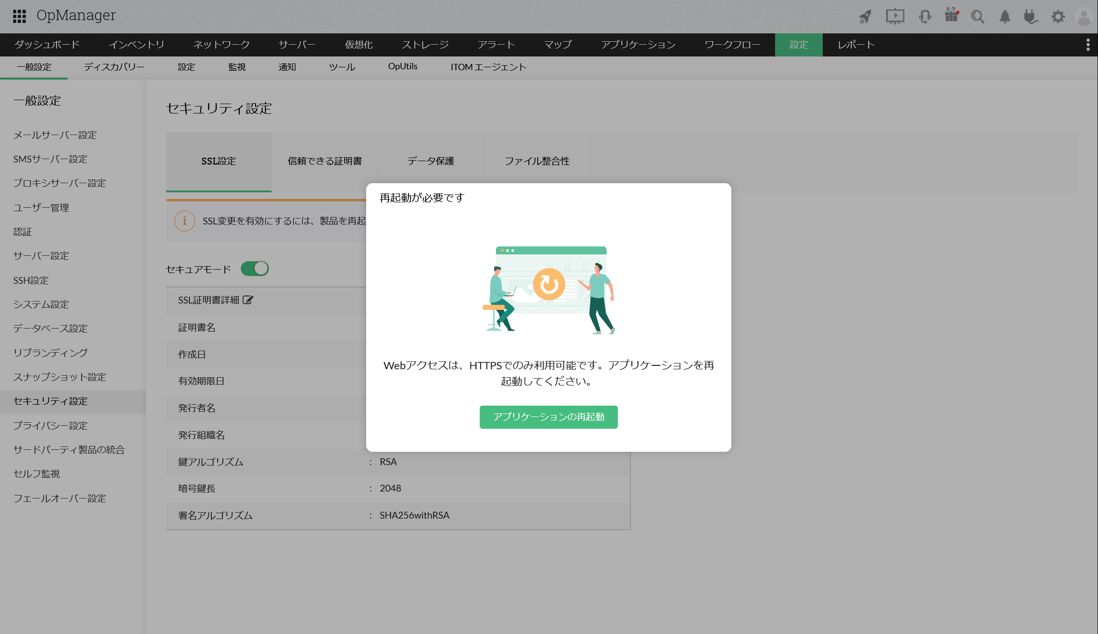 - [設定]→[一般設定]→[セキュリティ設定]→[SSL設定]へ移動します。
