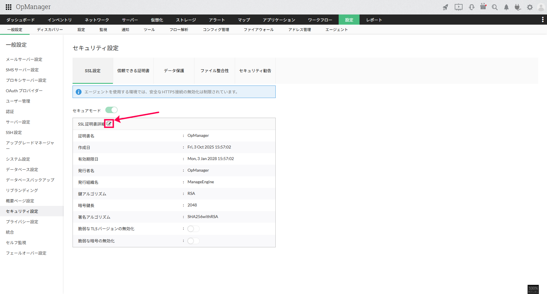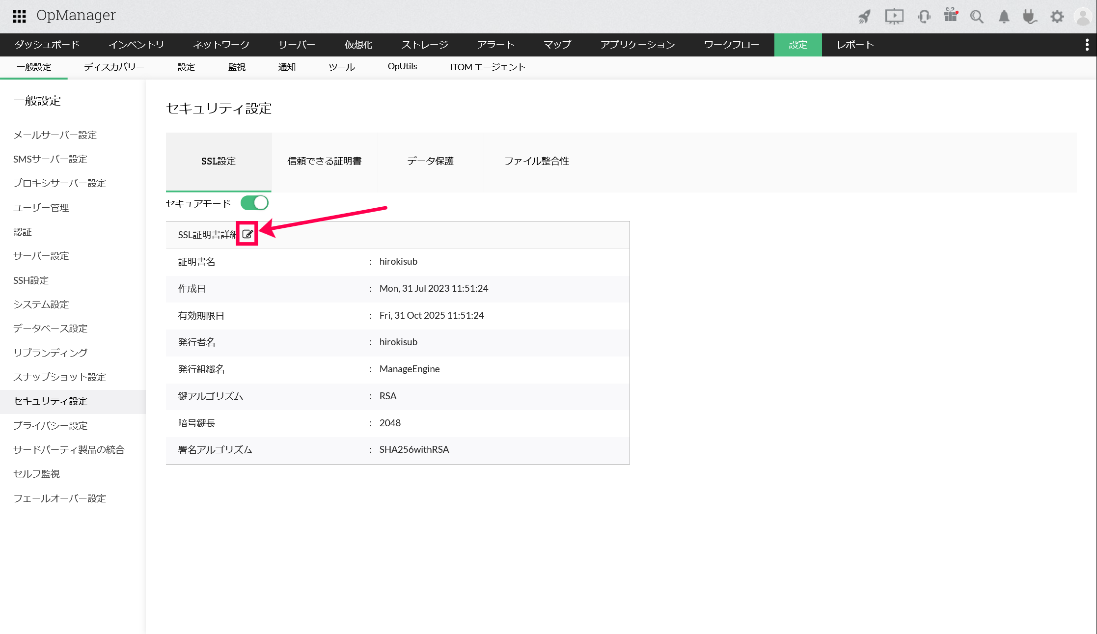「SSL証明書詳細」の隣に表示される編集アイコンをクリックします。
