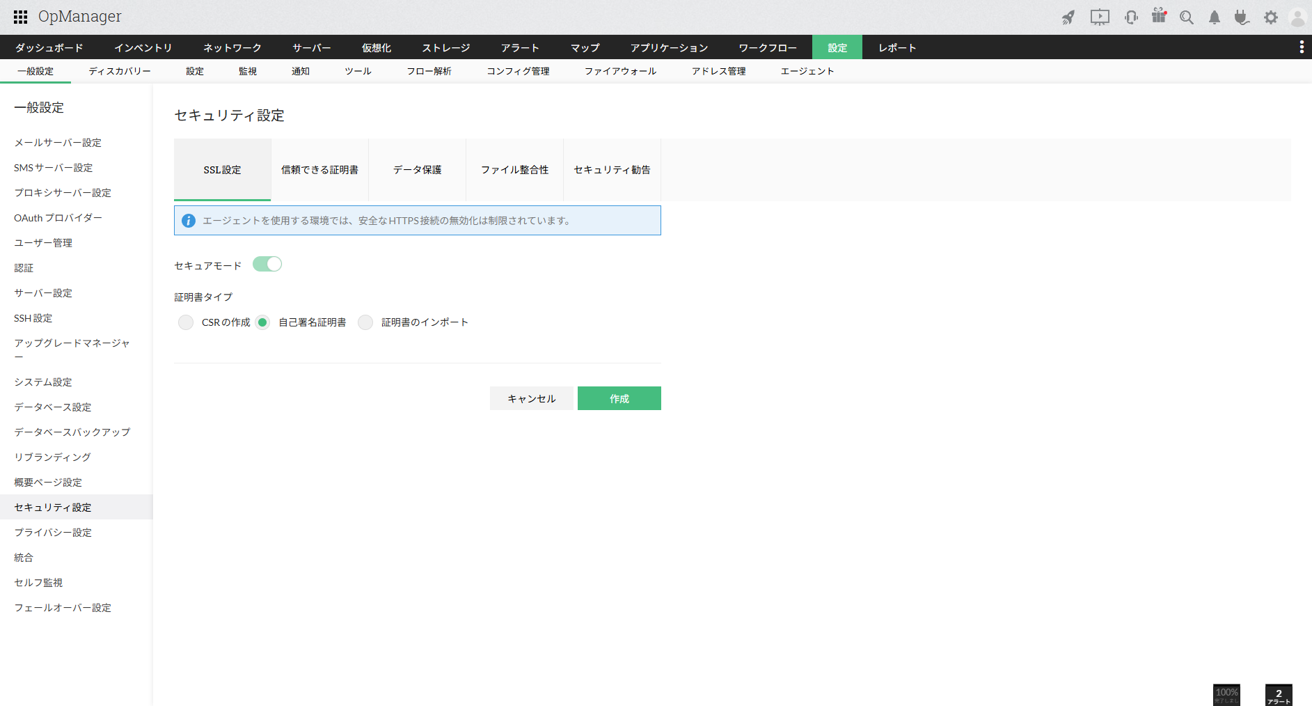 - 「証明書タイプ」で[自己署名証明書]を選択して[作成]をクリックします。
